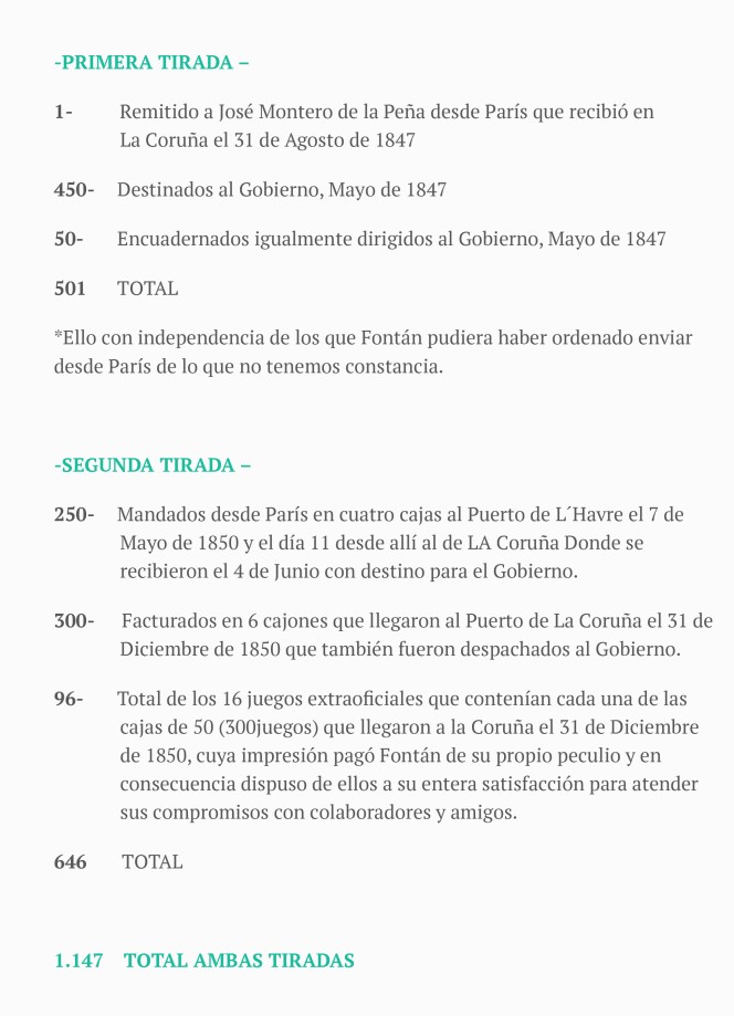 En un principio se imprimieron 500 juegos que Lémercier entregó a Bouffard para que éste se los remitiese directamente a Fontán, quien una vez recibidos en La Coruña, los últimos días del mes de Mayo de 1847, hizo entrega de los mismos al Gobierno Político de esa Ciudad.