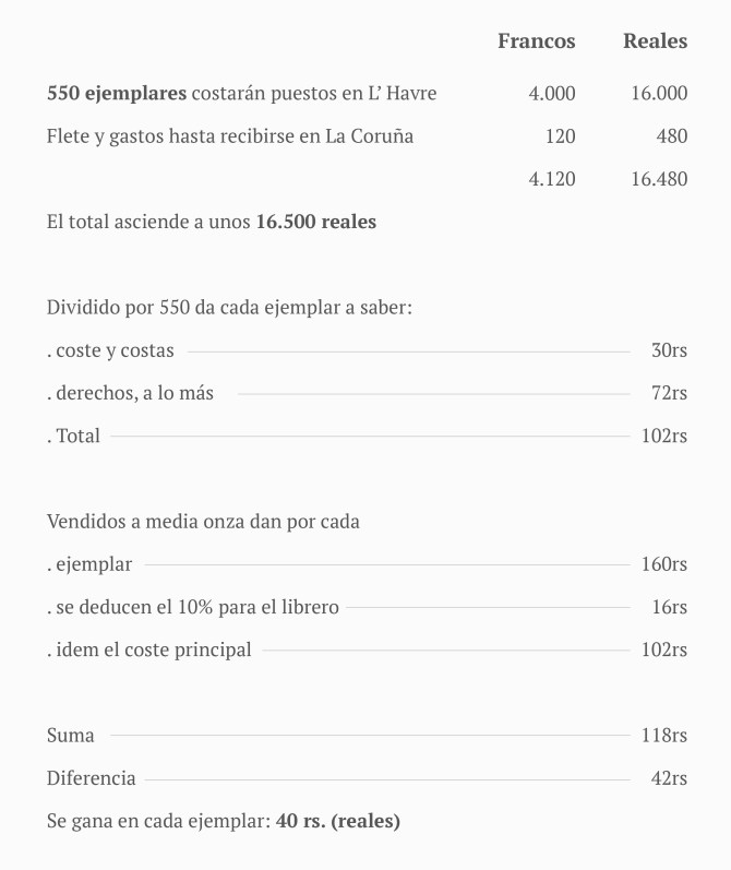 Me están pidiendo unos ejemplares, y yo no voy a procurárselos a ninguna persona a menos que sea en París. Uno de mis amigos necesita un ejemplar al objeto de realizar un proyecto de utilidad pública sobre la apertura de una gran carretera entre Ferrol y Lugo.