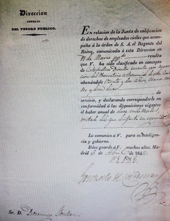 Fontán según interesaba fue clasificado el 26 de Junio de 1852, según consta en su expediente de la Junta de Clases Pasivas: