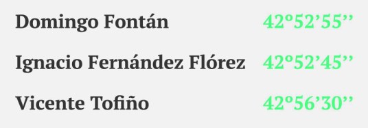 “… Pero la magnífica Carta de Fontán ha determinado la frontera portuguesa del norte y costa de Galicia si bien modificando detalles de una y otra con arreglo a los planes ya citados (de los marinos Espinosa y Bouza) y los publicados por la Sección Hidrográfica que en estas provincias son muy buenos y minuciosos…”