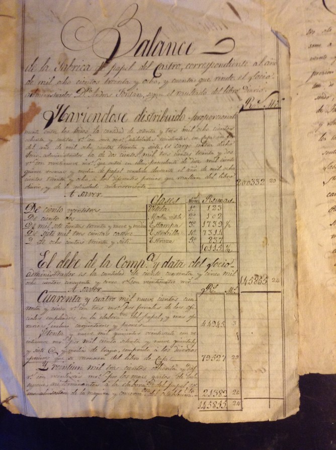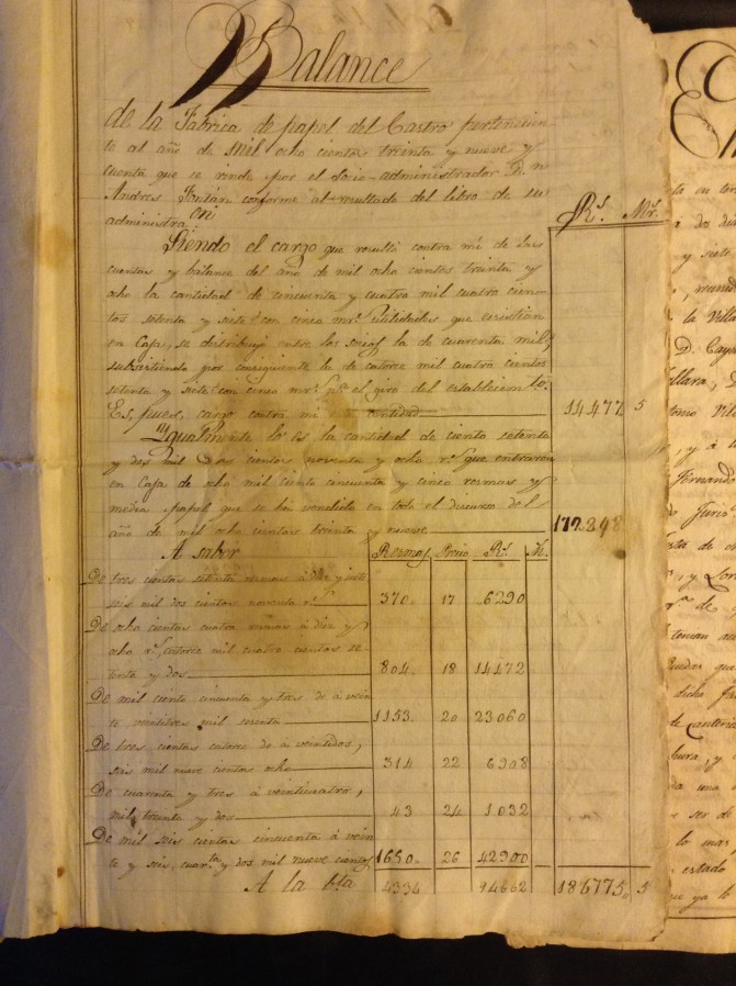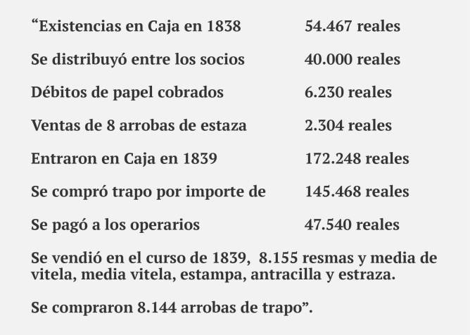 “….. debemos preparar otras 400 resmas lo más antes posible para el depósito de la nueva contrata luego que se aproveche el remate, lo que no debe tardar, mediando ya un mes desde el 23 de Octubre en que se firmó y debemos ver lo que se tarde en tener sacadas de tina otras 400 para el 1er. pedido que no dejará de hacerse antes de dos meses, porque si con mes y medio o desde el 2 de Octubre, surtida la Fábrica con 800 resmas, ya pide 400 es de creer que enviándoselas ahoras éstas, necesitará otras tantas antes de dos meses, es decir que o bastará una tina o será forzoso que sigan las 2 según el papel que hay hecho. De todo ello se deduce la necesidad de hacer cuanto antes otra rueda y hechas otra tina para no perder los parroquianos del comercio, sin esto es forzoso atender a la imprescindible obligación de la Palloza tal vez en las dos tinas. En fin tu conoces como yo y aún mejor la posición en que nos hallamos puedes buscar maderas y operarios como mejor te acomode”.