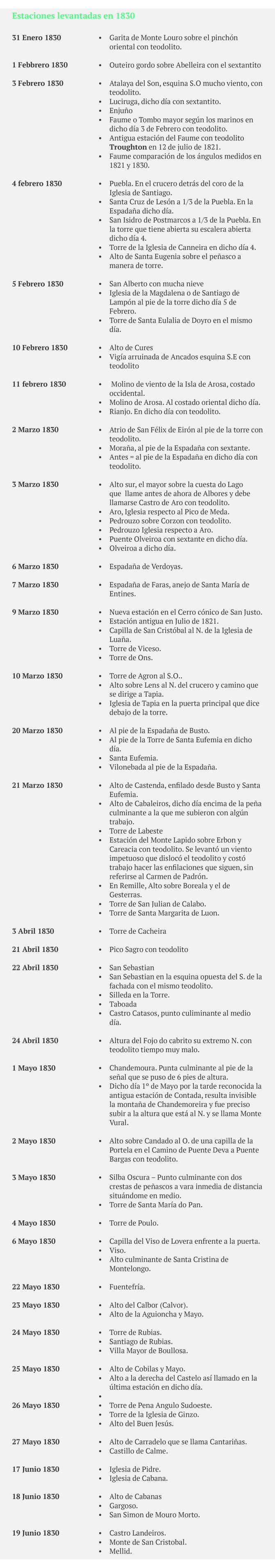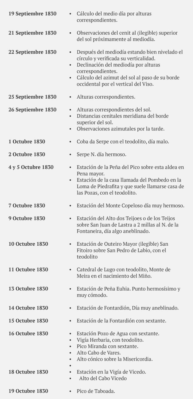 A tan digno profesor debió no solo el entusiasmo con que prefirió a toda otra ocupación, la de cultivar más y más el estudio de las Ciencias Naturales y Exactas, sino que el mismo le inspiró el pensamiento de emprender la triangulación de Galicia y el levantamiento de su Carta Geométrica y a este fin le adquirió en París los mejores instrumentos para llevar a cabo tan útil proyecto”.