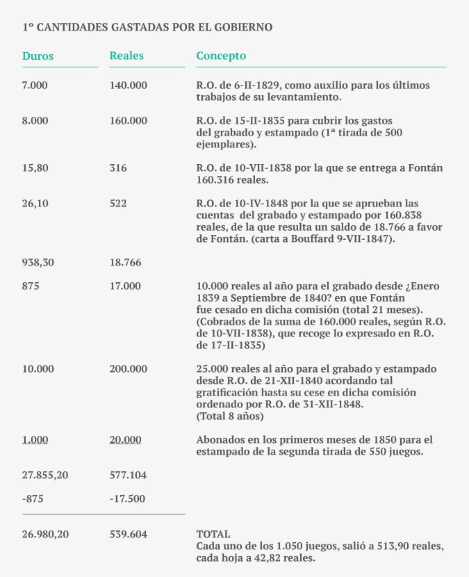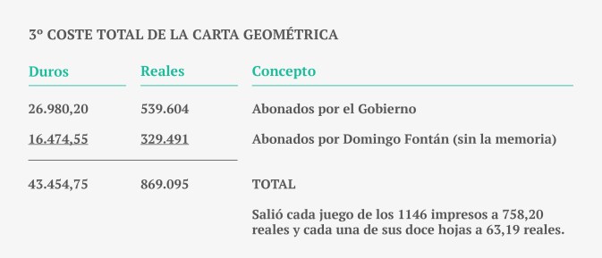Dicho presupuesto se refiere a la segunda tirada de la Carta Geométrica, una vez cerradas las cuentas de la primera con el Gobierno mediante Liquidación recogida en Real Orden de 10 de Abril de 1848, edición que Fontán decidió efectuarla a su costa para poder disponer de ella a su conveniencia.