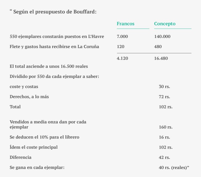 Del contenido del presupuesto nos llama la atención que Bouffard calculase para la impresión y transporte a la Coruña en 16.480 reales, cuando Fontán a tal fin abono 20.000 reales, por el mismo concepto, según se recoge en la Carta que el 5 de Noviembre de 1848 remite Ramón de la Sagra a Fontán solicitándole fondos e instrucciones para esa segunda tirada (ver artículo “Impresión de la Carta Geométrica”) donde le manifiesta que la suma de 2.000 Francos (8.000 reales) en poder de Bouffard no es cantidad suficiente para iniciarla.