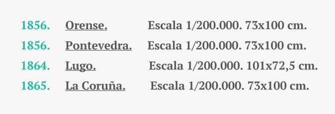 “De la primera mitad del Siglo XIX destacamos algunos mapas: la Carta Geométrica de Galicia dividida en sus provincias, La Coruña, Lugo, Orense y Pontevedra, subdividida en partidos y ayuntamientos, levantada por Don Domingo Fontán entre 1817 y 1834 en escala 1/100.000 en doce hojas en proyección Flamteed modificada, también denominada Bonne, con una precisa triangulación geométrica. Como se trata de un Proyecto Real, la Carta fue presentada a la Reina Gobernadora María Cristina de Borbón…”