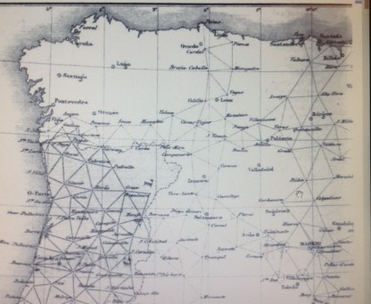 “Reconocido el país en toda su extensión proyectáronse de dos en dos grados próximamente y siguiendo la dirección Norte-Sur o la Este-Oeste, cadenas de triángulos de primer orden que dividen el territorio en grandes cuadriláteros y se enlazaron con otros también de primer orden, establecidos a lo largo de la costa uniéndose a la triangulación de Portugal y a la francesa del Pirineo y a la Meridiana de Dunkerke”.